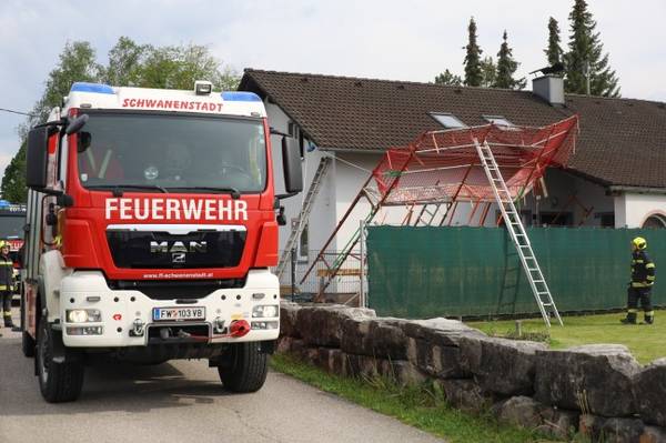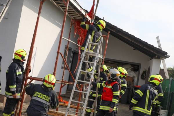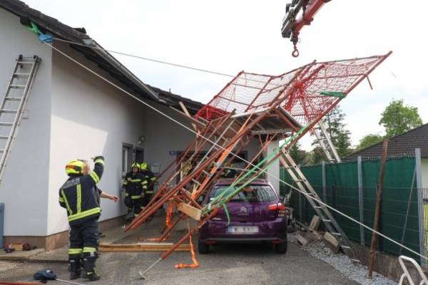 EDT BEI LAMBACH. Ein Gerüst ist Samstagnachmittag in einer Hauseinfahrt in Edt bei Lambach (Bezirk Wels-Land) auf ein parkendes Auto gestürzt. Drei Feuerwehren standen Samstagnachmittag in einer Siedlung in Edt bei Lambach im Einsatz, nachdem bei stärkeren Windböen ein Gerüst eines Wohnhauses umgestürzt ist. Ein Auto wurde durch das umstürzende Gerüst beschädigt. Die Feuerwehr sicherte das Gerüst mit einem Kran, ehe es dann in weiterer Folge abgebaut wurde. Verletzt wurde zum Glück niemand.