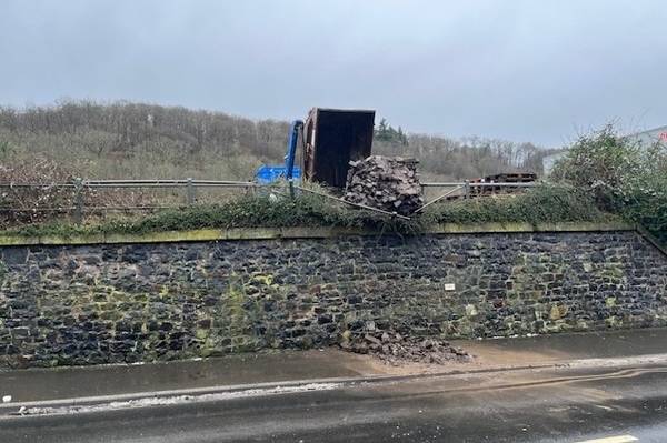 Mit Seilen gelang es dem Lkw-Fahrer, seine Ladung von der Kante nach vorne wegzuziehen und so die Gefahrenstelle zu beseitigen. Währenddessen mussten sowohl die Straße als auch der Radweg für den Verkehr gesperrt werden.