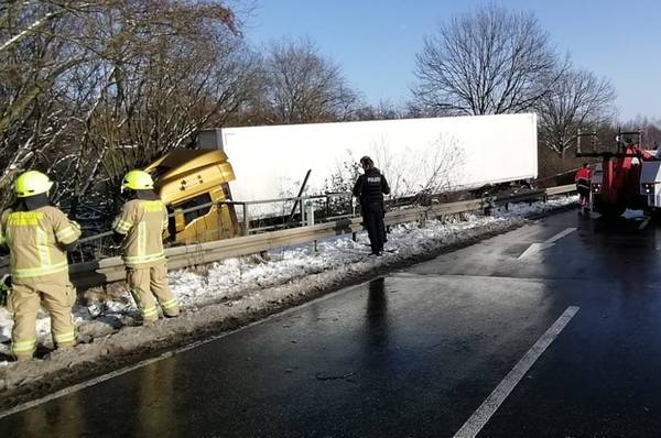 Die sich anschließende, aufwändige Bergung des Sattelschleppers erfolgte durch ein Spezialunternehmen und dauerte mehrere Stunden. Hierbei unterstützten die Kräfte an der Einsatzstelle das Bergungsunternehmen, nahmen ausgelaufene Betriebsstoffe auf und halfen der Polizei bei den Absperrmaßnahmen. Bevor die Straße endgültig wieder durch die Polizei freigegeben werden konnte, musste der Unfallbereich noch durch ein Fachunternehmen von Ölrückständen gereinigt werden.