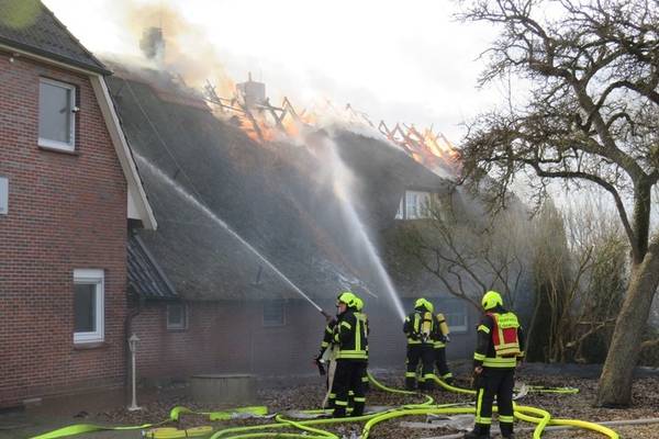 Oldenburg (ots) - Am Sonntag, gegen 13:45 Uhr, kommt es in der Hauptstraße in Edewecht zu einem Brand eines Wohn-/Geschäftshauses. Durch einen Passanten wurde zunächst eine Rauchentwicklung im Bereich des Dachgiebels des betroffenen Reetdauchhauses bemerkt. Bis zum Eintreffen der umgehend alarmierten Feuerwehr entwickelten sich bereits offene Flammen. In der Folge wurde das reetdachgedeckte Wohnhaus durch den Brand völlig zerstört. Ein Übergreifen auf das angrenzende Wohn-/Geschäftshaus konnte unter großem Kräfteaufwand von 150 Kameraden der freiwilligen Feuerwehren Edewecht, Elmendorf, Jeddeloh, Husbäke, Friedrichsfehn, Osterscheps und einem Leiterwagen der Berufsfeuerwehr verhindert werden. Die Wohn- und Geschäftsräume sind durch die Löscharbeiten jedoch ebenfalls stark beschädigt worden. Aufgrund der starken Rauchentwicklung wurden Anwohner gebeten Fenster und Türen geschlossen zu halten. Die Hauptstraße wurde für die Dauer der Löscharbeiten bis in die Abendstunden voll gesperrt. Die Ermittlungen zur Brandursache dauern an.