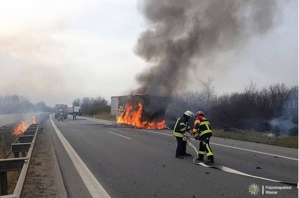 Auch Bereiche des Mittelstreifens sowie der Außenbankette gerieten in Brand und wurden durch Kräfte mehrerer eigesetzter Freiwilligen Feuerwehren aus dem Landkreis Nordwestmecklenburg sowie aus der Hansestadt gelöscht. Der entstandene Sachschaden beläuft sich ersten Schätzungen zufolge auf etwa 50.000 Euro.