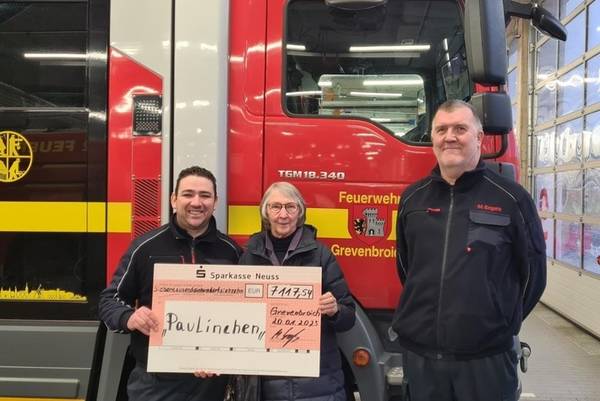 Eigentlich wollten die Florianer das gesammelte Geld schon zum "Tag des brandverletzten Kindes" am 7. Dezember übergeben. Nach Kontakt mit der Stiftung wurde die offizielle Übergabe nun aber auf den Januar verlegt. Jetzt konnte Marguerite Mathis von der Stiftung "Paulinchen" den Scheck auf der Feuerwache Grevenbroich persönlich in Empfang nehmen. Die Düsseldorferin ist seit 30 Jahren engagierten Mitglied der Stiftung, nachdem ihr Sohn mit 16 Jahren schwerste Verbrennungen erlitt und nach der Rettung durch die Feuerwehr, Ärzte und durch die Unterstützung der Stiftung heute ein fast normales Leben führt. "Ich bin allen Beteiligten bis heute dankbar und deswegen freue ich mich besonders über diese Aktion", sagt Mathis.