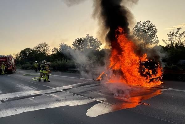 Um 20:09 Uhr wurde die Feuerwehr Gladbeck zu einem PKW-Brand auf die A2 in Fahrtrichtung Oberhausen alarmiert. Das Fahrzeug fing plötzlich an zu brennen und kam im Bereich des Autobahnkreuzes Bottrop auf der Hauptfahrbahn zum Stehen. Auslösegrund war vermutlich ein technischer Defekt. Der Fahrer konnte sich zwar eigenständig aus dem Fahrzeug befreien, verletzte sich hierbei allerdings leicht. Der Mann ist durch den anwesenden Notarzt aus Bottrop versorgt und zu einem Krankenhaus transportiert worden. Das Feuer konnte schnell unter Kontrolle gebracht werden, da jedoch auch Kraftstoff ausgelaufen ist, der zum Teil auch auf der Fahrbahn brannte, musste die komplette Fahrbahn gesperrt und aufwendig gereinigt werden. Die Sperrung zog einen kilometerlangen Stau nach sich. (DA)