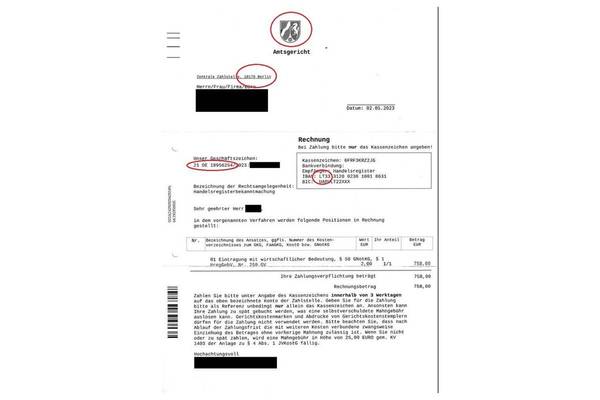Getarnt unter Absendern wie "Handelsregistereintragung" oder "Zentrale Zahlstelle Justiz" fordern die Täter Rechnungsbeträge von mehreren Hundert Euro ein. Die Schreiben wirken offiziell, sind etwa mit einem Wappen versehen und nennen die korrekten Daten des Empfängers wie die zugehörige Handelsregisternummer, das Veröffentlichungsdatum und das zuständige Amtsgericht. Es wird auf eine zügige Zahlung hingewiesen.