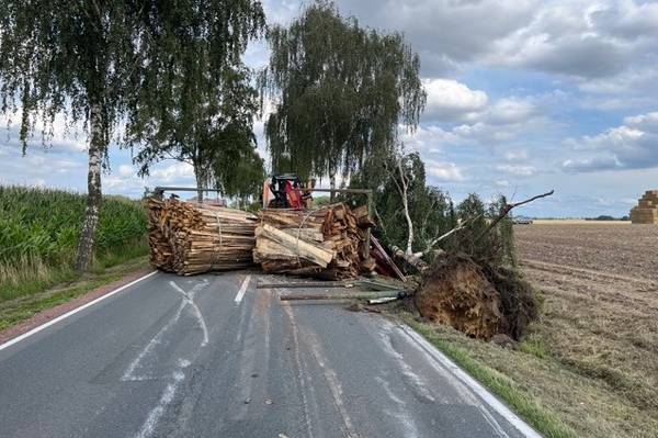 Am Dienstag gegen 15.35 Uhr verunfallte ein Lkw mit Anhänger auf der L 342 im Bereich Heiligenloh. Der 45-jährige Fahrer war mit seinem voll mit Holz beladenen Lkw und Anhänger auf dem Weg Richtung Twistringen. Aus noch ungeklärter Ursache verlor er die Kontrolle über das Fahrzeug. Der Lkw geriet in den Seitenraum, zerstörte einen Baum und ein Straßenschild, schleuderte zurück auf die Straße wo der Anhänger umkippte. Die Ladung Holz verteilte sich auf der gesamten Breite der Straße. Der 45-jährige Fahrer bleib unverletzt, stand aber unter Alkoholeinfluss. Eine Überprüfung ergab eine Konzentration von 1,1 Promille. Ihm wurde eine Blutprobe abgenommen und die Polizei beschlagnahmte seinen Führerschein. Die Landesstraße musste längere Zeit für die Unfallaufnahme, Bergung des Lkw und seiner Ladung voll gesperrt werden. Der Verkehr wurde örtlich umgeleitet. Nach ersten Schätzungen beträgt der Schaden rund 15000 Euro.
