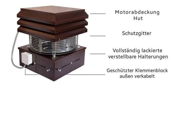 Der Sauger besteht normalerweise aus hitzebeständigen und witterungsbeständigen Materialien wie Edelstahl oder Aluminium. Er kann manuell über einen Schalter oder automatisch über ein Steuerungssystem betrieben werden, das je nach Zugverhältnissen des Kamins aktiviert wird.