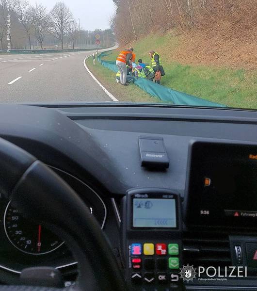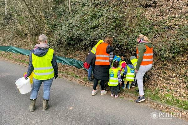 Eine Rettungsaktion der besonderen Art hat eine Streife der Polizeiinspektion 1 in der vergangenen Woche abgesichert. An zwei Tagen unterstützten die Einsatzkräfte im Frühdienst auf diese Weise die Initiative der "Amphibienfreunde Otterberg" zur Rettung von Fröschen, Kröten und Molchen.