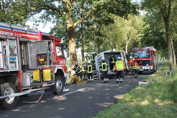 Auf der K 109 zwischen Anderlingen und Haaßel ist der Fahrer eines Kleintransporters von der Straße abgekommen und frontal gegen einen Baum gefahren, hierbei wurde der Fahrer in seinem Fahrzeug schwer eingeklemmt.