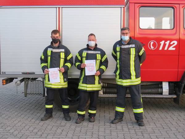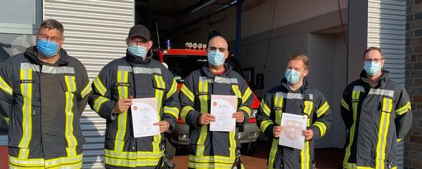 Auch die Löschgruppe Donsbrüggen durfte den Übungsbetrieb nach langer Zeit endlich wieder aufnehmen. Am Dienstag, dem 15. Juni erhielt die Löschgruppe ebenfalls Besuch von Stadtbrandinspektor Ralf Benkel, der Ehrungen und Beförderungen persönlich vornahm: Für 10 Jahre Mitgliedschaft in der Feuerwehr wurden Robin Schmeißer und Klaus Voßkamp geehrt. Markus Hecht hat im vergangenen Jahr den zweiten Teil der Grundausbildung erfolgreich abgeschlossen und wurde zum Oberfeuerwehrmann befördert.