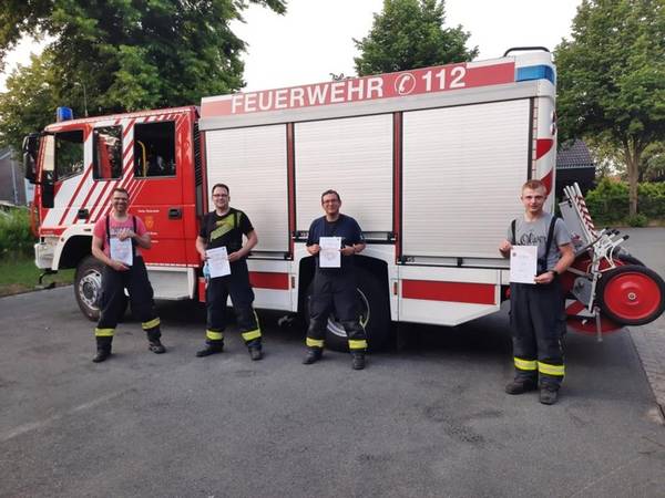 Auch bei der Löschgruppe Wardhausen-Brienen konnte der Übungsbetrieb am 10. Juni wieder aufgenommen werden. Hierzu stattete Stadtbrandinspektor Ralf Benkel der Löschgruppe einen Besuch ab. Nach der Übung mit anschließender Nachbesprechung konnte der Leiter der Feuerwehr Kleve dann zwei Kameraden der Löschgruppe befördern: Nach dem erfolgreichen Besuch des F-III-Lehrgangs beim Institut der Feuerwehr in Münster wurde Michael Groenewald zum Brandmeister ernannt. Weiterhin ernannte Ralf Benkel den Einheitsführer Karl-Heinz Stoffels zum Hauptbrandmeister.