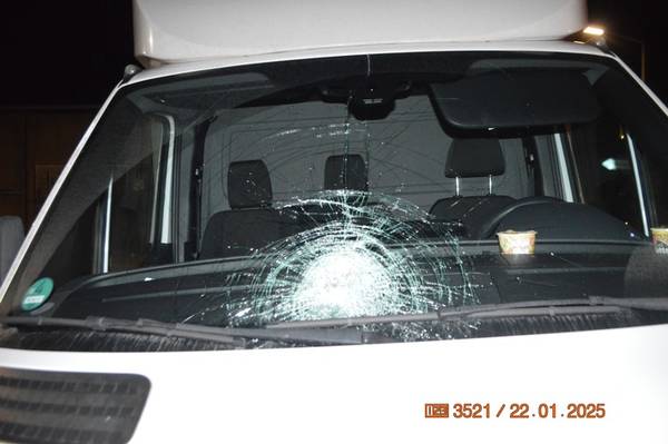Um 19.00 Uhr befuhr ein 35jähriger Klein-Lkw Fahrer die B83 aus Richtung Bad Eilsen kommend in Richtung Hasengarten. In Höhe der Fußgängerbrücke, die von den Hofwiesen in das benachbarte Kleinenbremen/NRW führt, konnte der Autofahrer aus Lübbecke die Silhouette einer Person auf der Brücke erkennen. Die Person hatte eine Jacke/Oberteil mit reflektierenden Elementen getragen. In die Windschutzscheibe des Lkw schlug ein Gegenstand ein, evtl. ein geworfener Stein, der die Windschutzscheibe großflächig zerspringen ließ. Der Gegenstand drang nicht in das Führerhaus ein; der 35jährige blieb unverletzt.