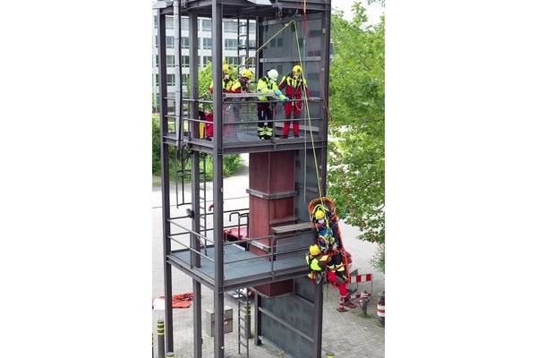 Bei der zweiten Übung mussten die Wettkampfteilnehmer einen verletzten Arbeiter mehrere Meter durch einen senkrechten Schacht nach oben auf eine Plattform retten und dann wieder auf den Erdboden bringen. Auch hier kamen verschiedene Seilsicherungs- und Tragensysteme zum Einsatz. Diese Technik wird unter anderem bei Baustellenunfällen oder bei Rettungseinsätzen in beengten Räumen in großer Höhe angewendet.